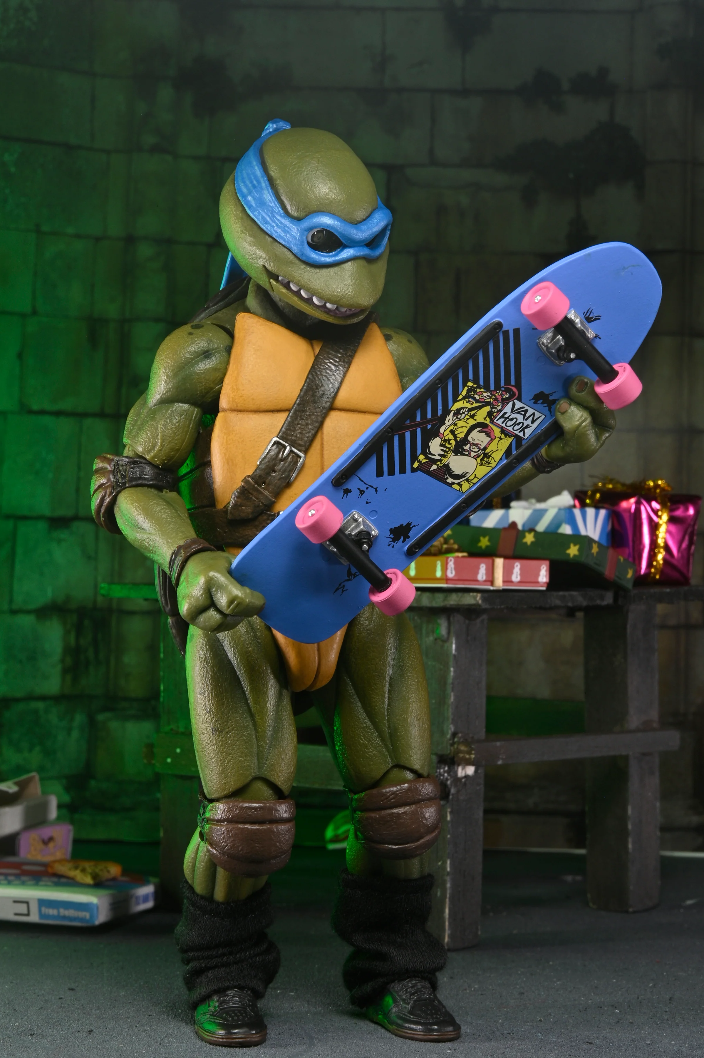 Standing in 7-inch scale, these festive figures are sure to bring the yuletide cheer... and gasp! They have hinged jaws to add an extra level of expression and enjoyment to your collection. Their very merry accessories include Santa hats, scarves with wire inserts for dynamic holiday party poses, and soft goods leg warmers to keep the cold-blooded reptiles warm during the holiday season. Plus, extra hands, presents, tangled Christmas lights, sewer lid, framed pizza, bell, and skateboard! Comes in collector-friendly VHS-inspired packaging.
