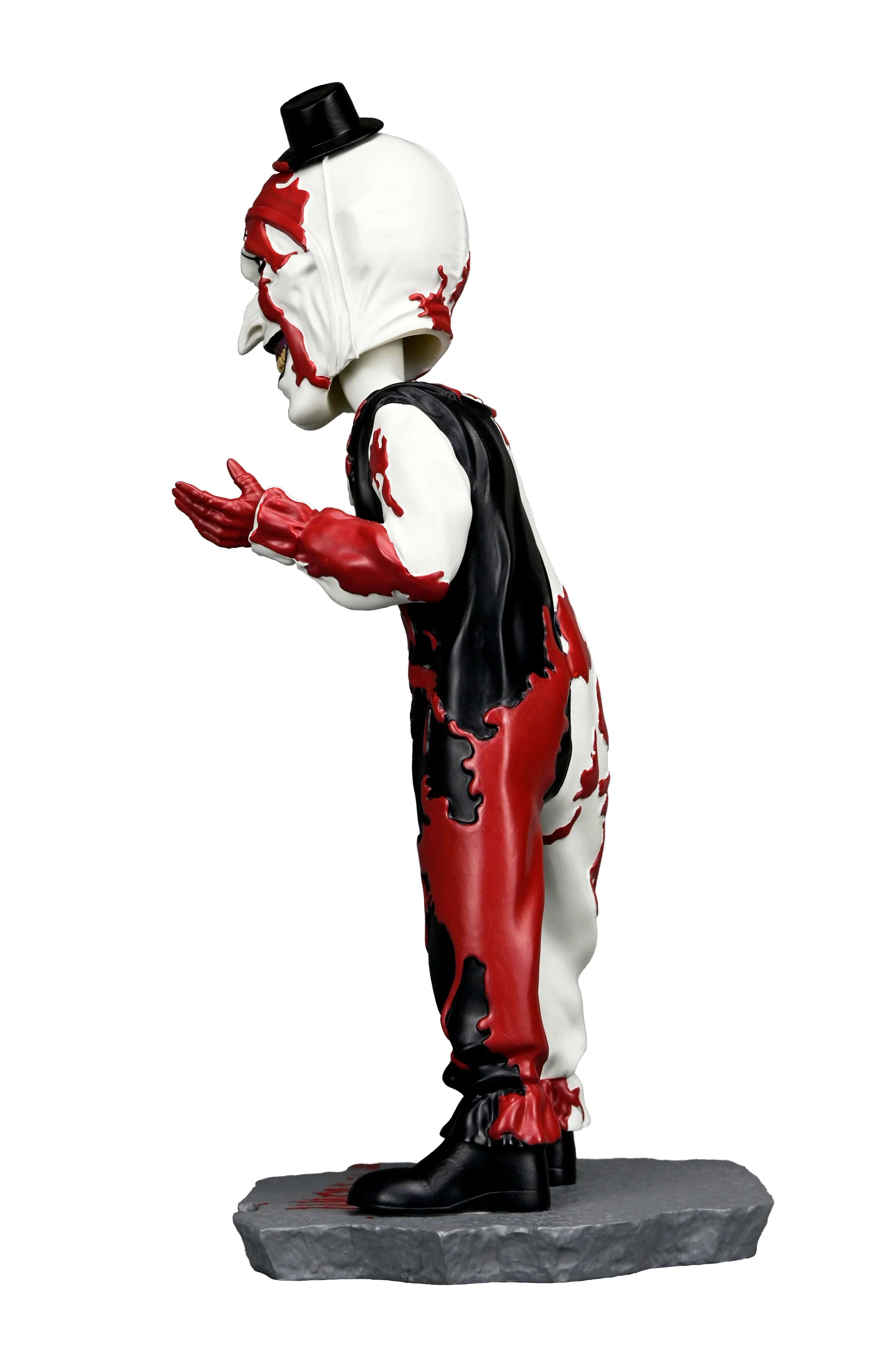The enigmatic Art the Clown is ready to haunt your nightmares! The iconic and demonic serial killer from Damien Leone’s Terrifier is now a Head Knocker from NECA. This interactive collectible measures over 8 inches tall and features a spring mechanism that allows for horrifying head bobble movement. Comes in collectible matte packaging with spot gloss finish.